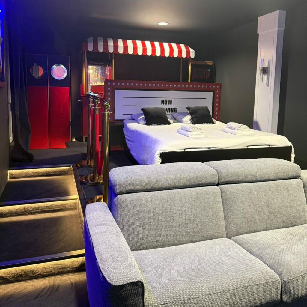 Idéale pour une soirée immersive ou un séjour original entre amis, la Cinéma Room plonge dans l’univers du grand écran avec décor thématique, salle cinéma privée, lit électrique, canapé relax, écran 4K géant, son Dolby Atmos, vibrations synchronisées totale IMAX.