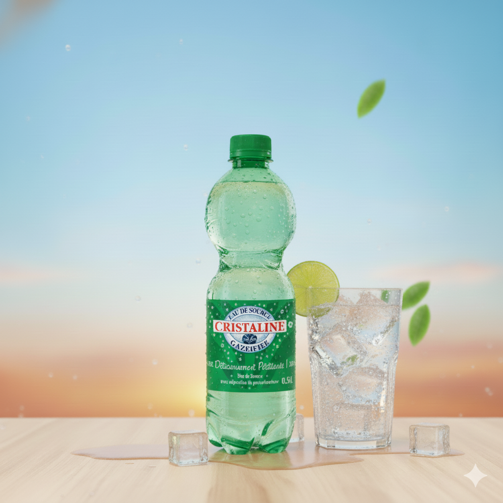 Une bouteille d’eau gazeuse de 50cl, conservée au frais dans le réfrigérateur.