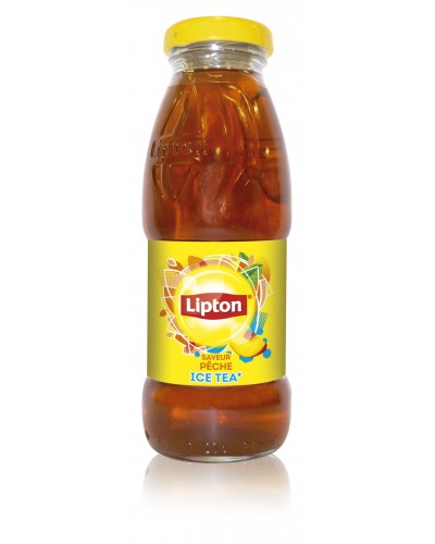 Bouteille en verre consignée de 25cl, goût pêche, disponible au frais dans le réfrigérateur.